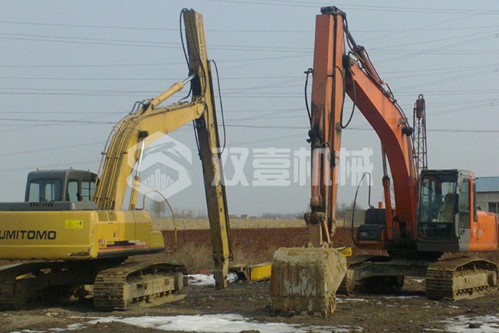 加長臂:加長臂是我們最常見,使用時間更早的大小臂加長臂,不需要伸縮缸控制。它通過大臂、小臂同時加長,配帶小挖斗,擴大機械的工作范圍。